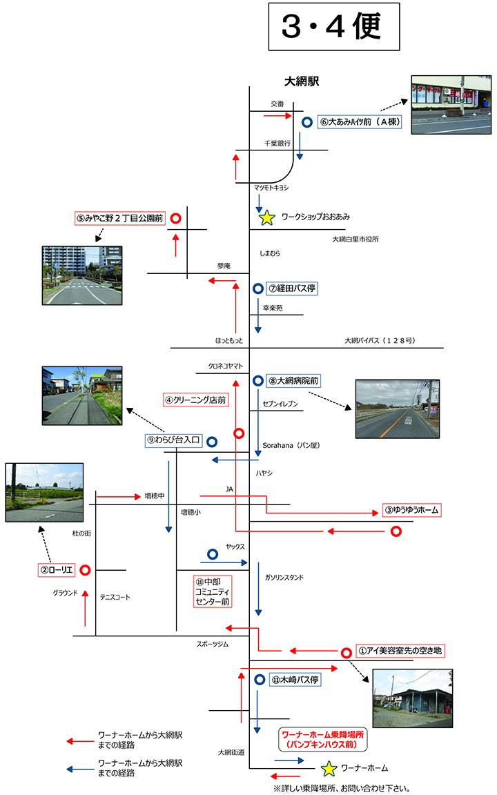 交通案内 JR大網駅下車 小湊バス(白子車庫行・サンライズ九十九里行)「旭ガラス前」下車 徒歩10分